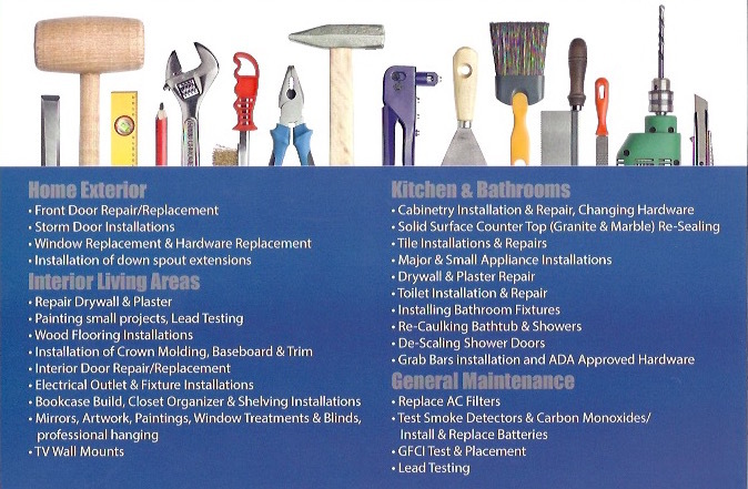 We typically take care of several jobs in one call with substantial savings to our clients. If you need help with general home maintenance, are a new homeowner or preparing your home for a sale, we can fix it!